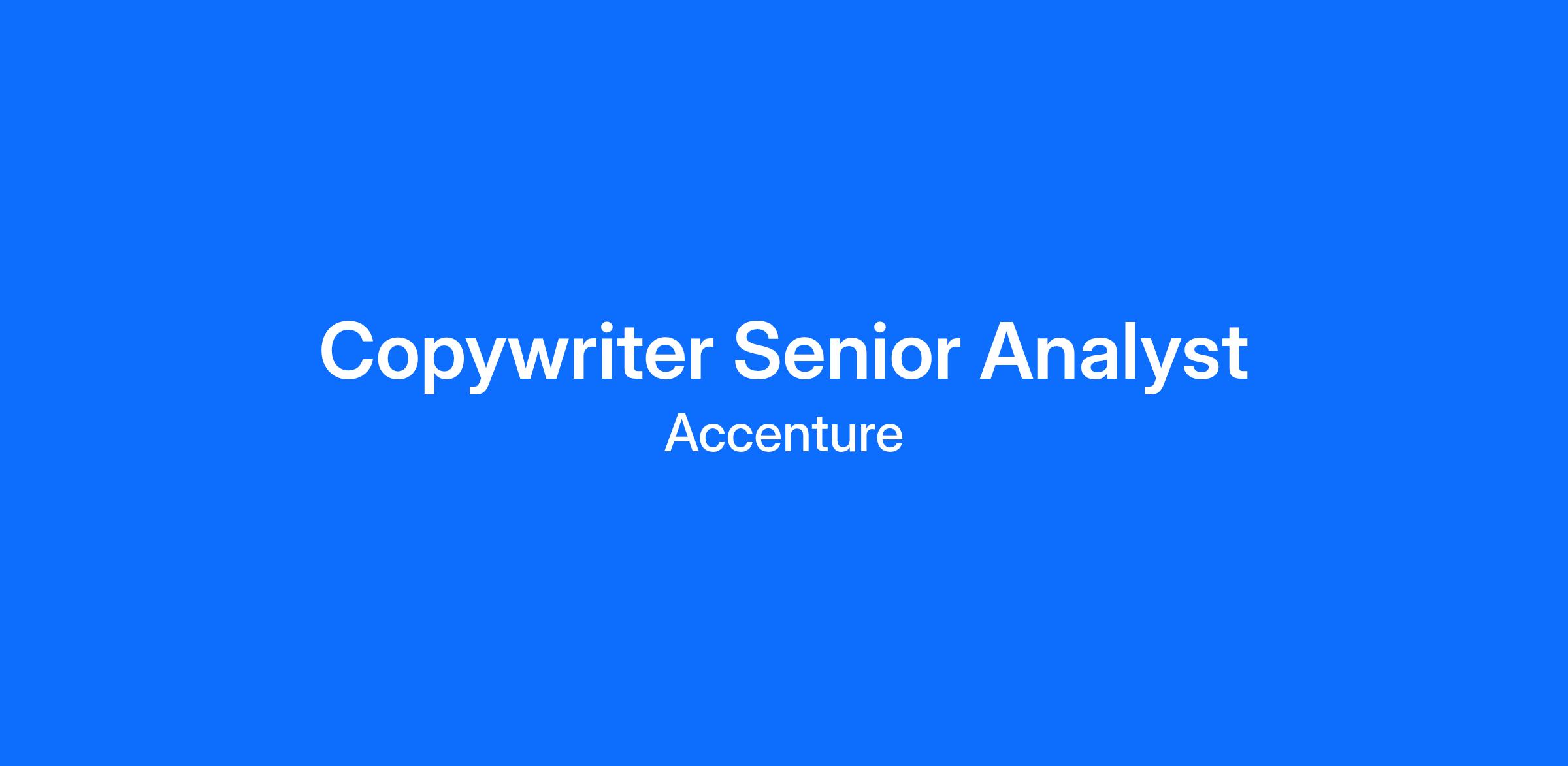 A Copy & Content Design Senior Analyst plays a pivotal role in crafting compelling and impactful communication materials that resonate with our diverse clientele and audiences. This person must be able to execute exceptional copywriting that effectively communicates our brand's message, taking full advantage of the media used. Furthermore, a Copy & Content Design Senior Analyst collaborates closely with cross-functional teams, providing seamless content integration for internal teams & initiatives, Accenture studios and departments, and clients and businesses across various channels and platforms.
